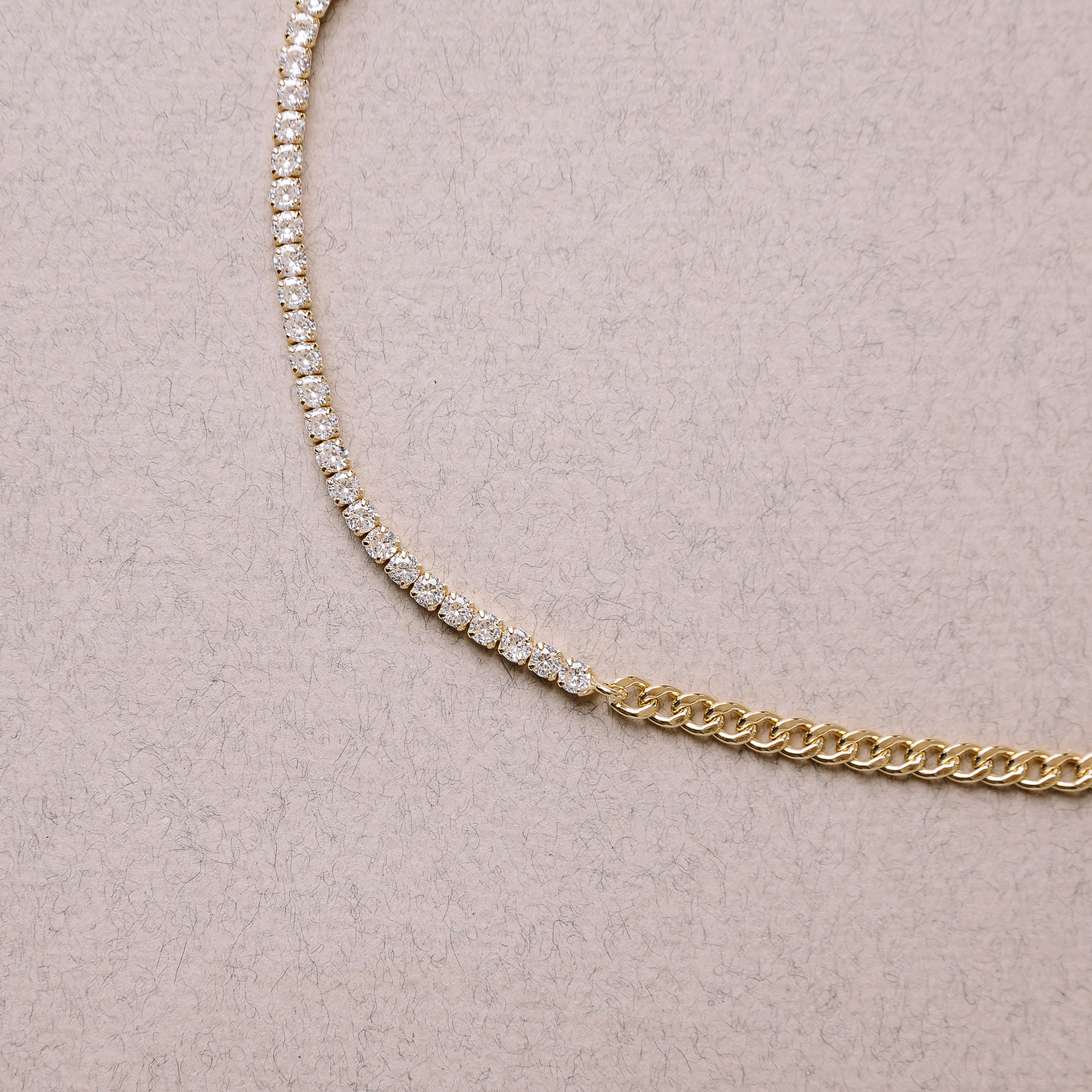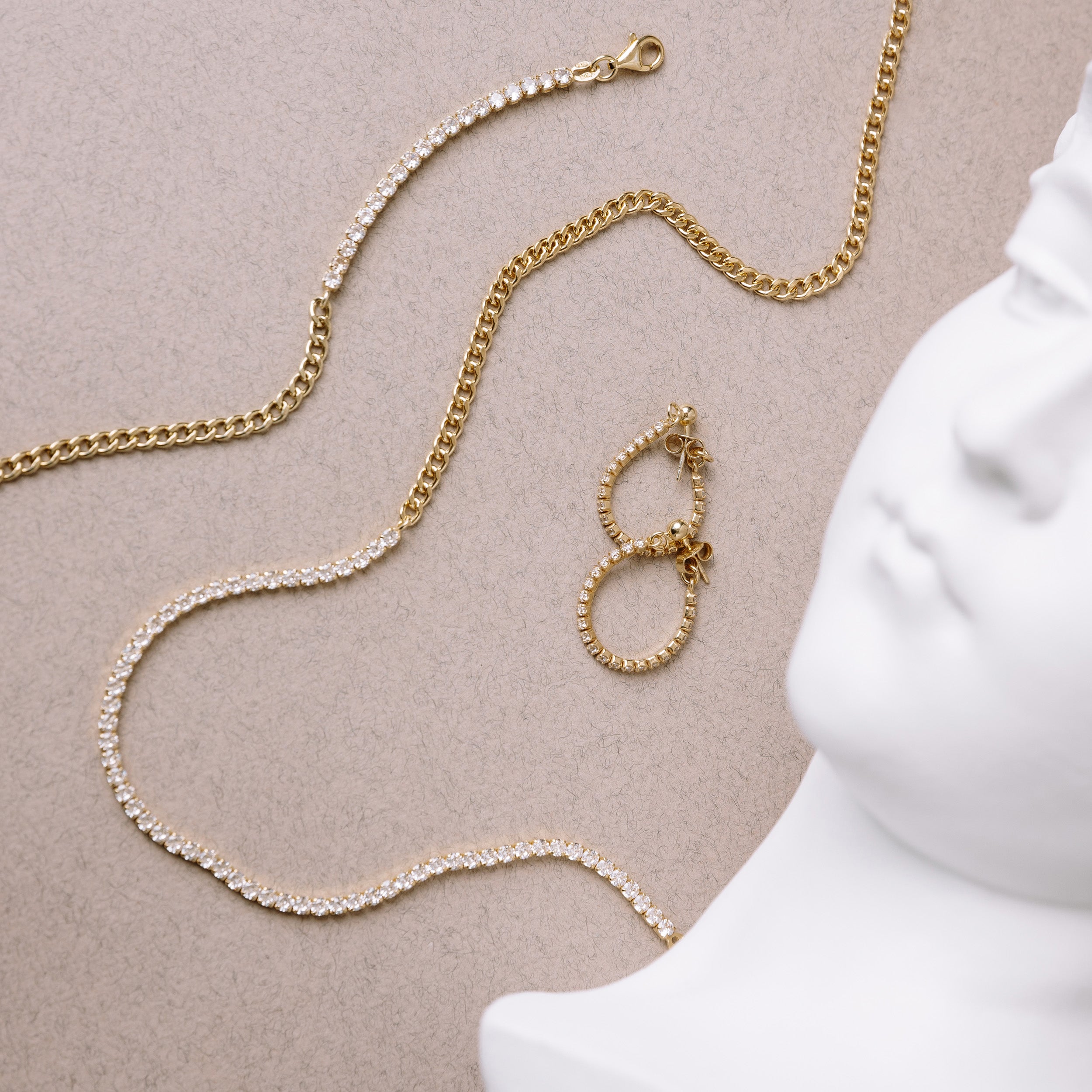 Aurora choker ogrlica je koja potpuno prijanja uz Vaš vrat. Napravljena je od kombinacije nanizanih cirkona u stilu tenis ogrlice i pancer lanca. Ovim dizajnom dodali smo cool city vibe klasičnoj tenis ogrlici.