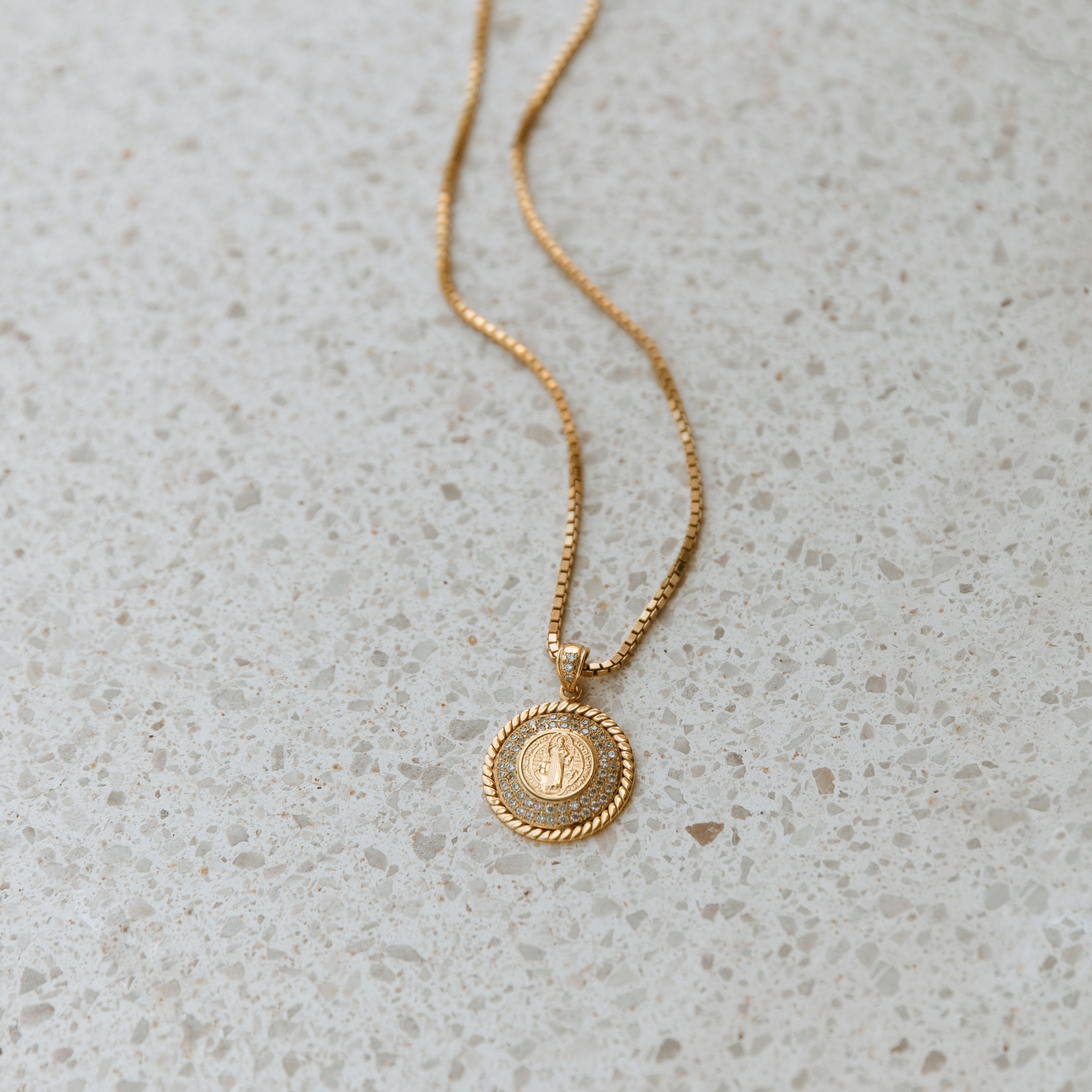 Srebrni privjesak sv. Benedikta optočen cirkonima savršeni je medaljon za summer layering. Dostupan je u dvije veličine, small i medium koje se osim u veličini malo razlikuju i u dizajnu. Medium privjesak na rubu ima opleteni krug i u tome se razlikuje od small privjeska.