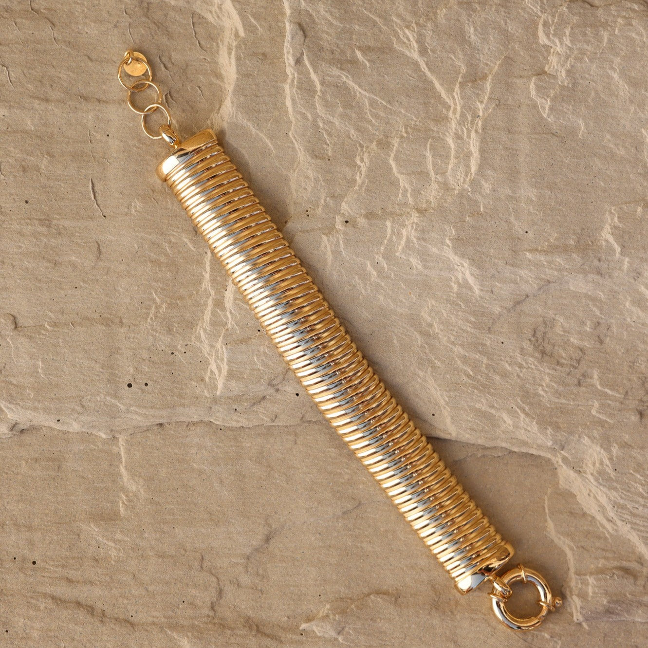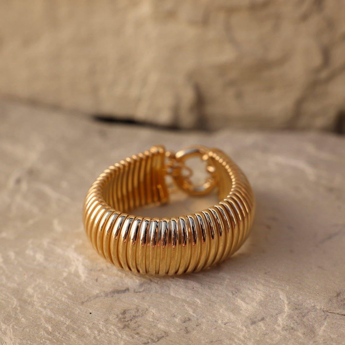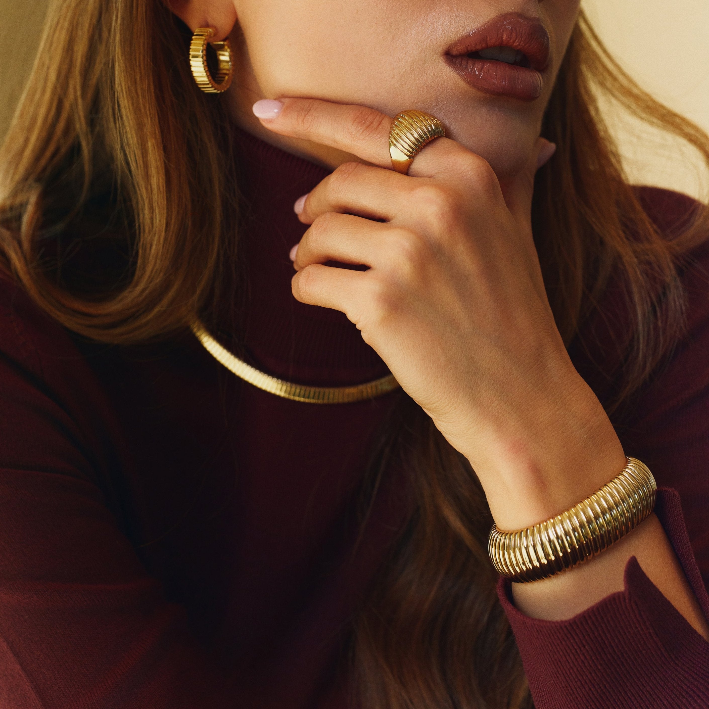 Cleo maxi ogrlica zatvorenog je tipa. Narukvica je voluminozna, chunky i fashion elegantna. Pravi statement komad. Stoji usko uz zapešće i svojim konkavnim oblikom daje dojam sve veće voluminoznosti.