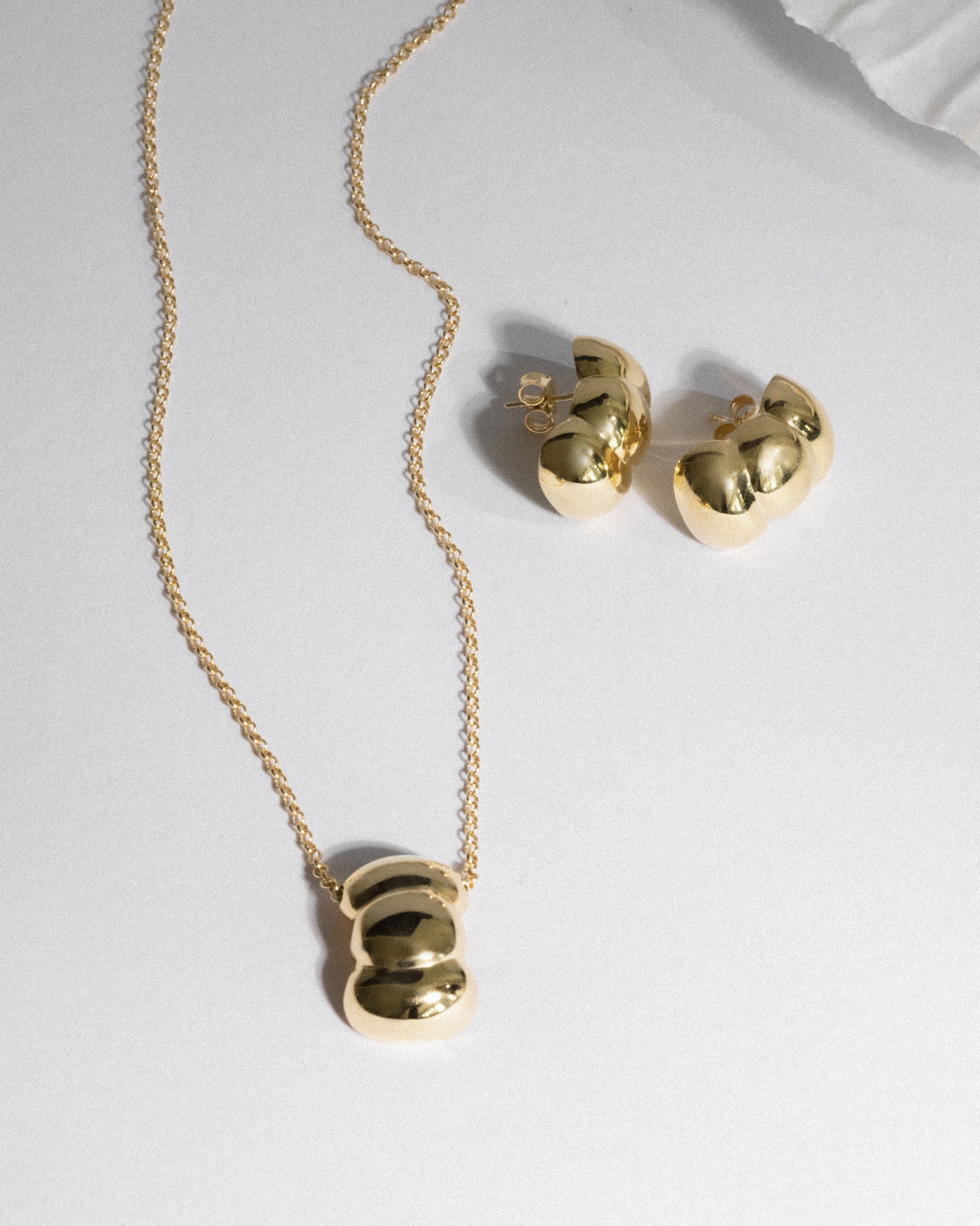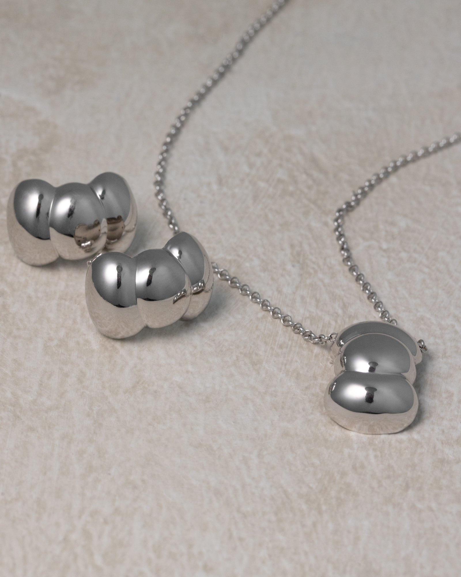 Ova moderna ogrlica spaja čvrst i tanak anker lančić s jedinstvenim. Privjesak je sastavljen od tri zaobljena, glatka i sjajna segmenta koji zajedno stvaraju jedinstvenu, skulpturalnu formu. Kombinacija jednostavnog lanca i upečatljivog privjeska donosi savršen balans između minimalizma i karaktera, idealna za sve prilike.