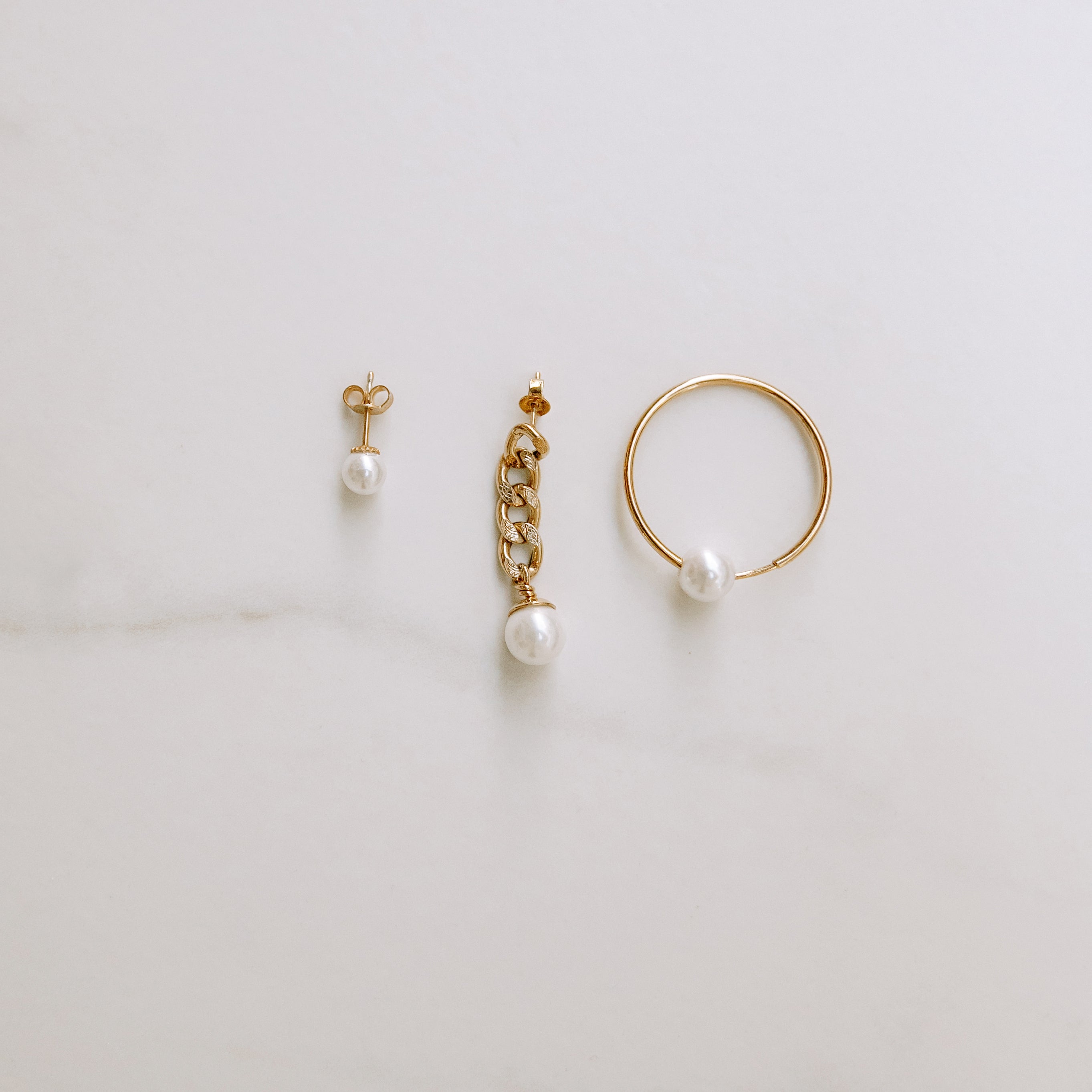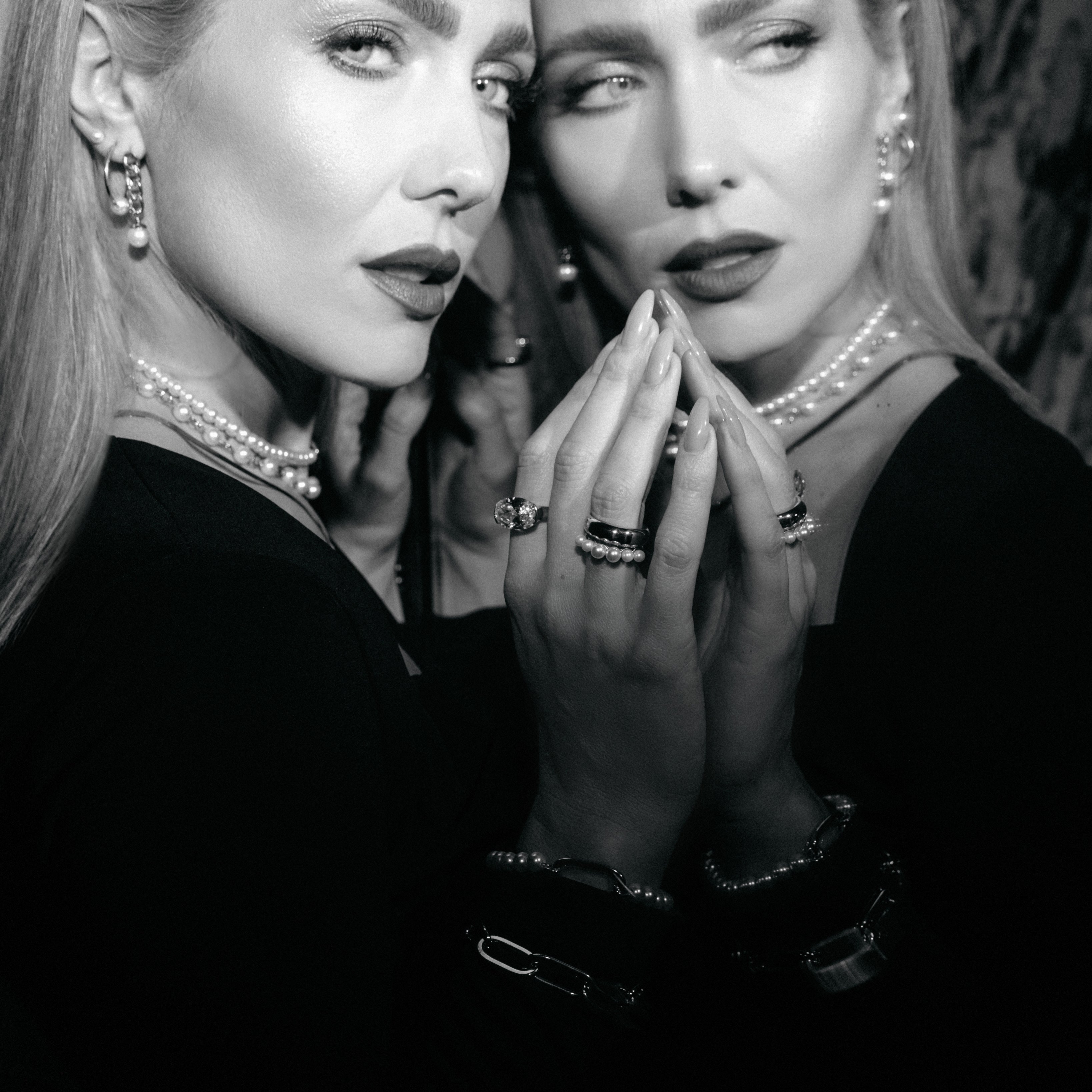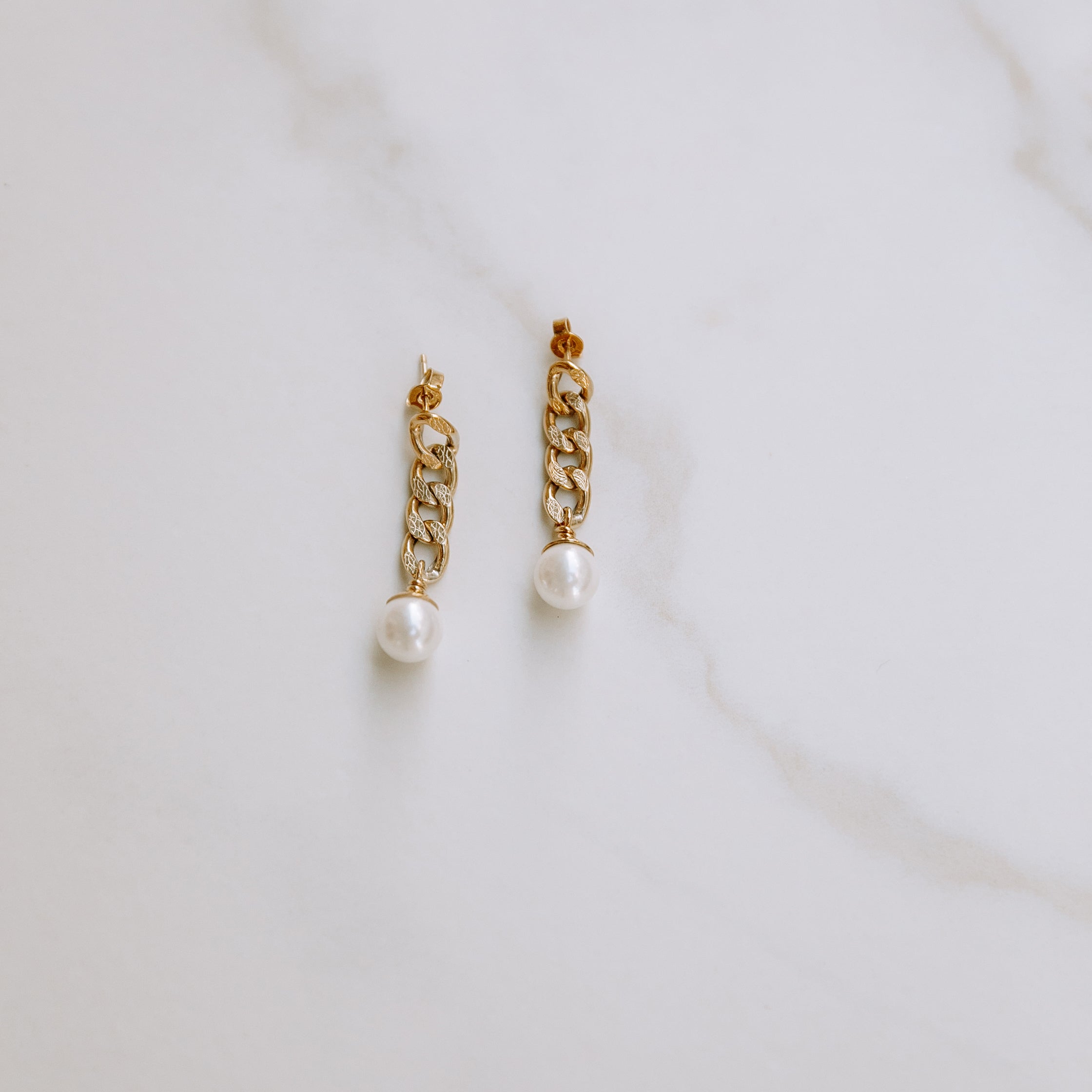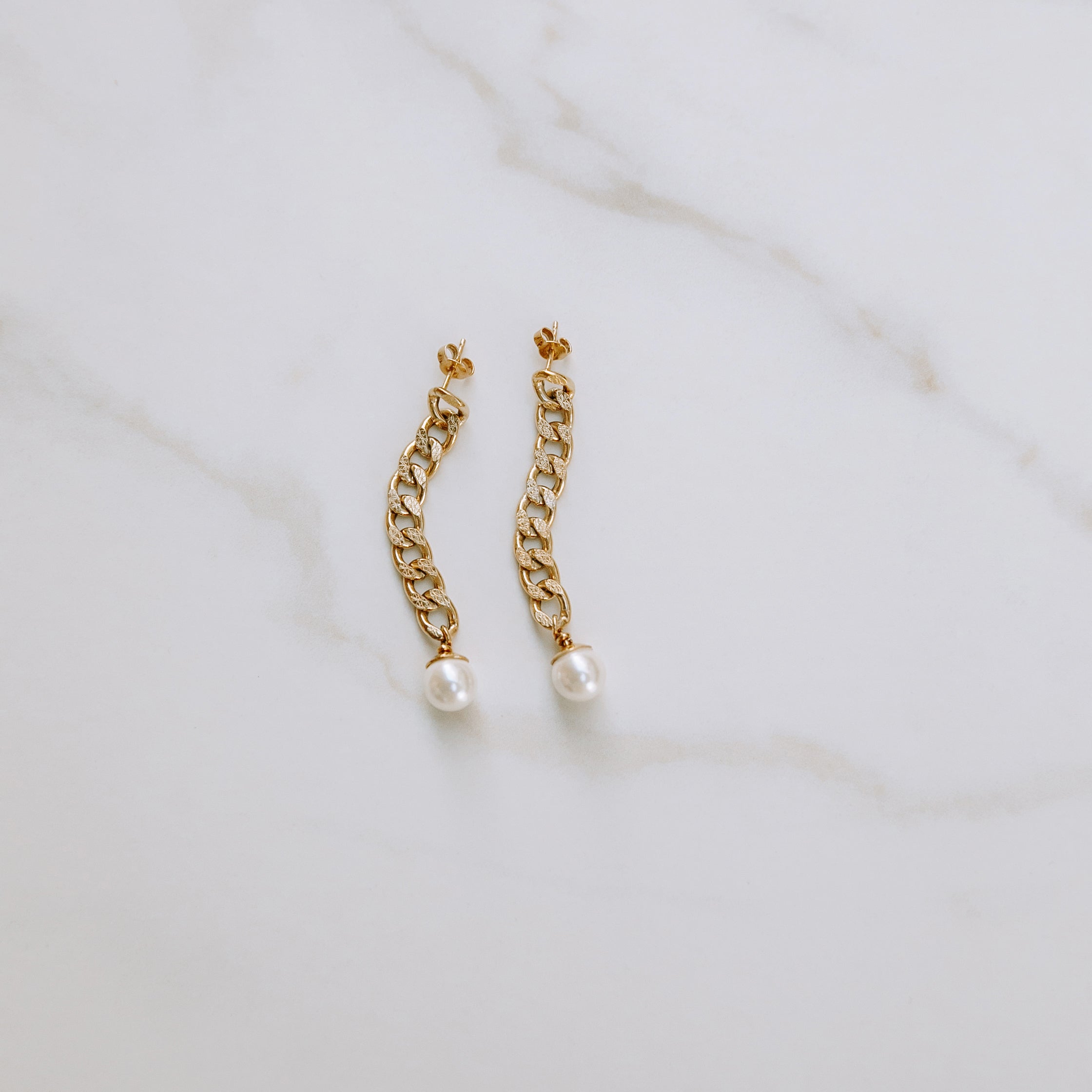 Viseće naušnice izrađene u srebru 925 moderan su koncept pancer lanca i bisera u naušnici. Naušnice pomaknute klasične elegancije sa edgy twistom odgovarat će svakom obliku lica.