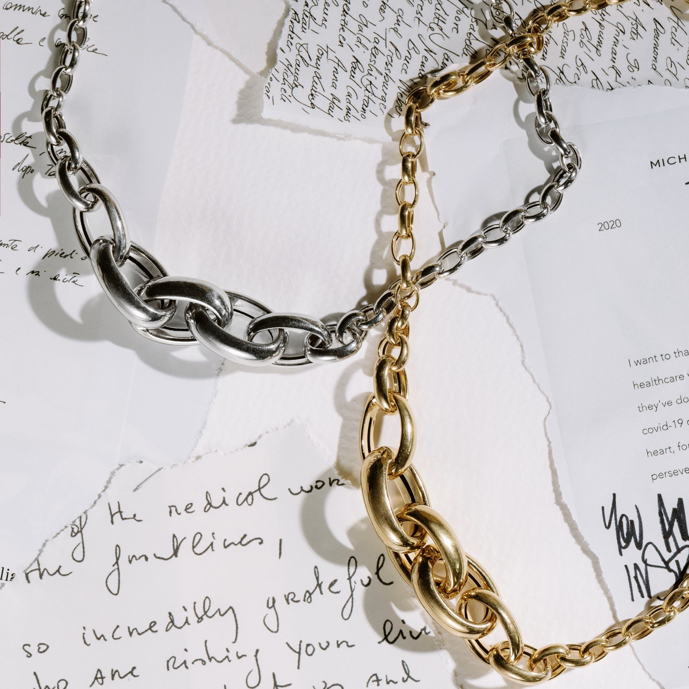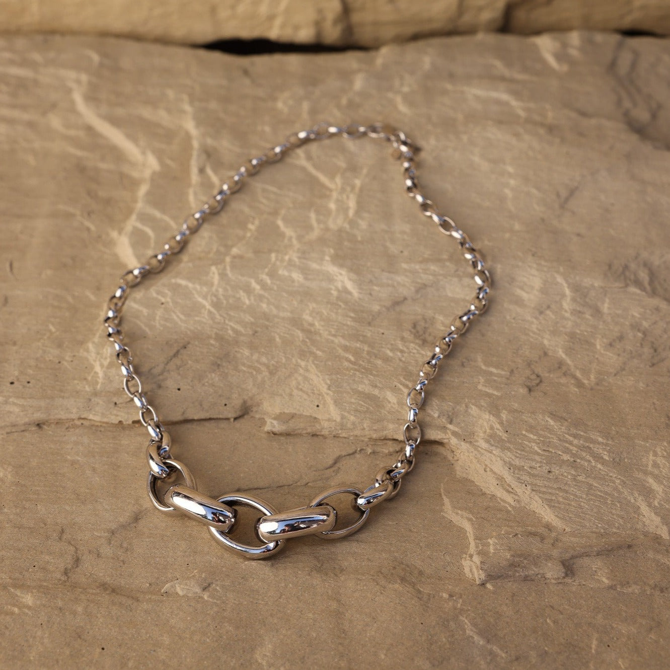 Link necklace je srebrna pozlaćena ogrlica anker tipa sa skalare dizajnom. Ogrlica se prema sredini povećava u dimenzijama karika i kreira glomazniji izgled na vratu. Ovakav tip ogrlice možete stilizirati u svim prigodama. Odgovarat će kako haljinama tako i trapericama uz bijeli t-shirt.