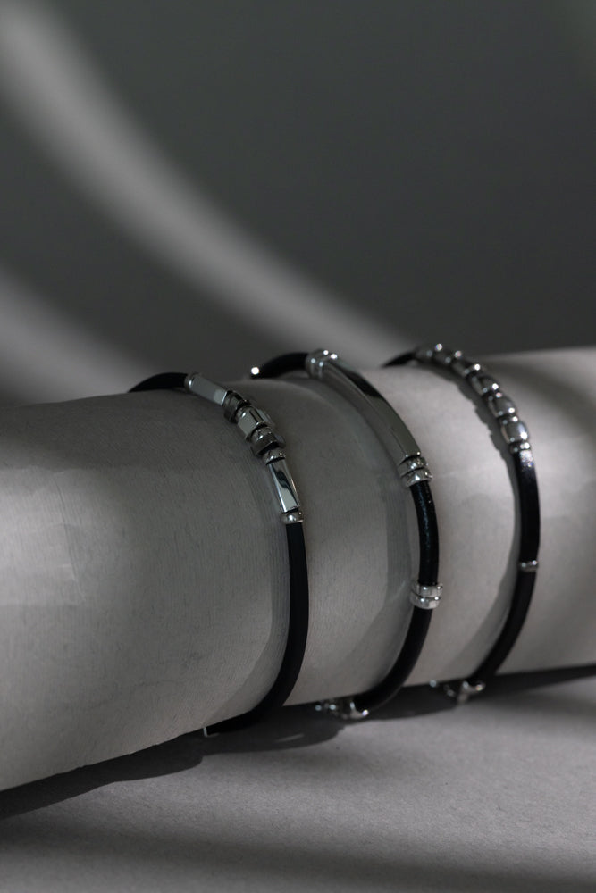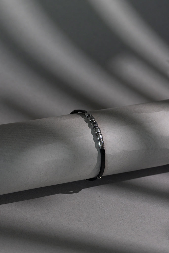 Muška narukvica od srebra 925 i kože. Ova narukvica kombinira crnu kožu s precizno postavljenim srebrnim elementima 925 – simetričnim, cilindričnim oblicima koji stvaraju ritam i teksturu na zapešću. Niska profinjenih detalja donosi suptilan tech-industrial vibe, dok crna koža zadržava jednostavnost i udobnost.