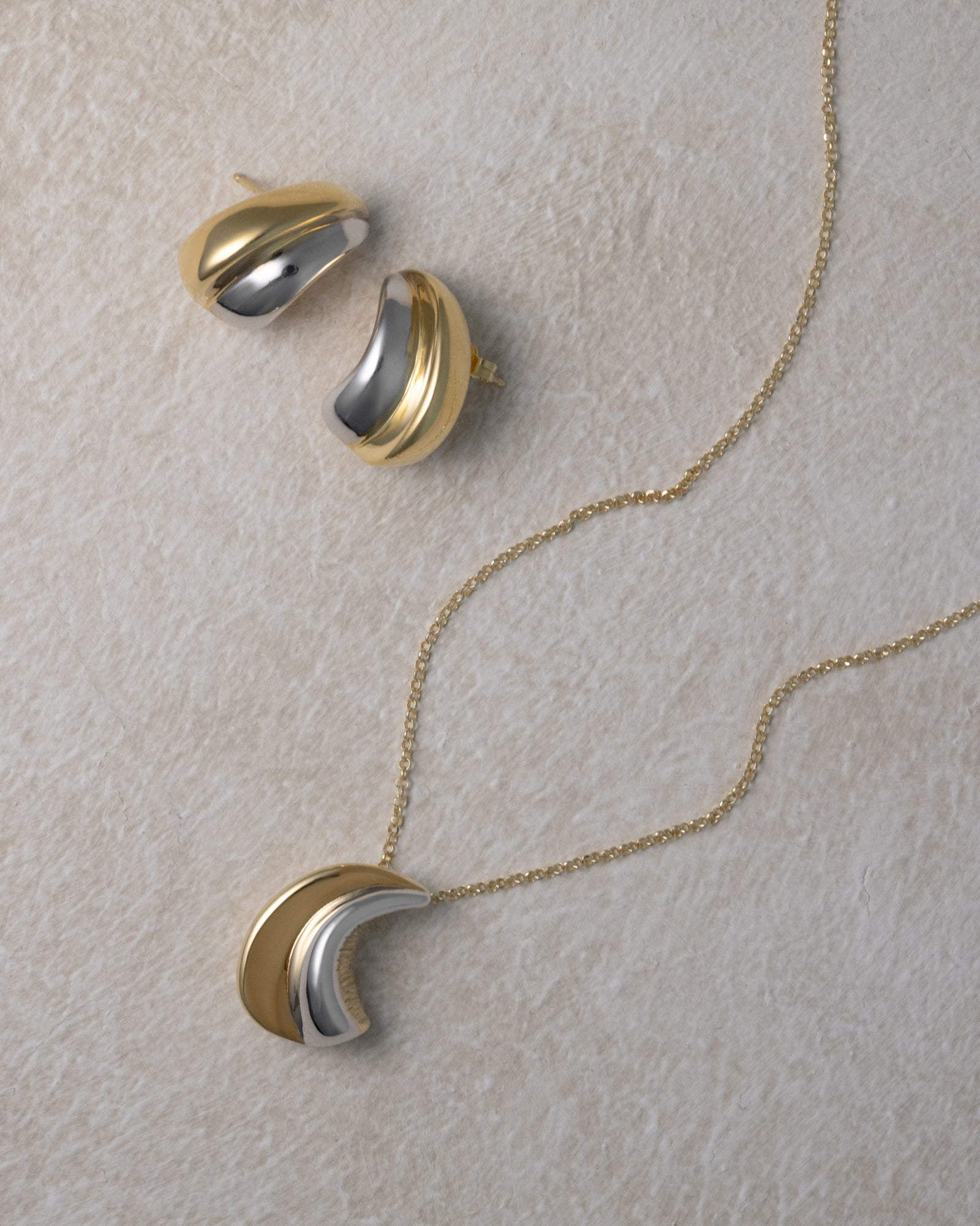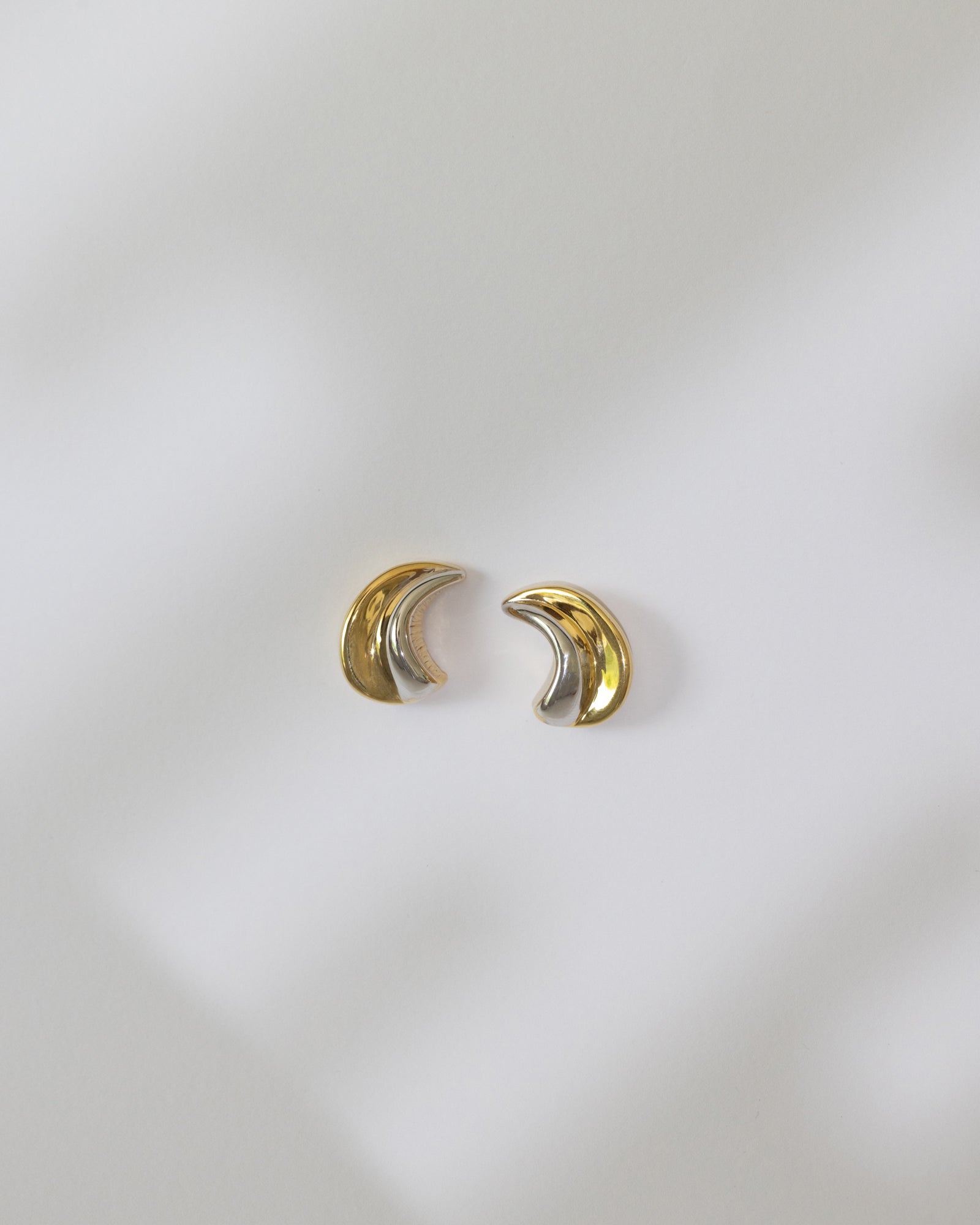 Naušnice Moon nose prepoznatljiv polumjesečev oblik, te imaju lijevu i desnu naušnicu kako bi što ljepše uokvirile lice. Polovica naušnice je u sjajnoj srebrnoj boji, dok druga polovica donosi toplinu zlatnog tona, stvarajući suptilan, ali upečatljiv kontrast. Glatke i elegantne, nježno prate linije uha, savršene za svaki dan ili kao sofisticirani detalj u vašem stilu.