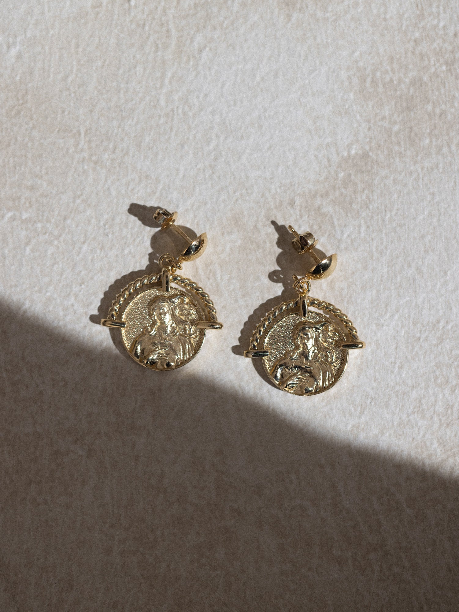 Istinski umjetnički statement za ljubiteljice klasike i elegancije – ove viseće pozlaćene naušnice utjelovljuju duh renesansne ljepote i suvremenog dizajna. Oblikovane kao medaljoni promjera 2cm, naušnice nježno vise s uha, stvarajući profinjen pokret i igru svjetlosti pri svakom koraku.