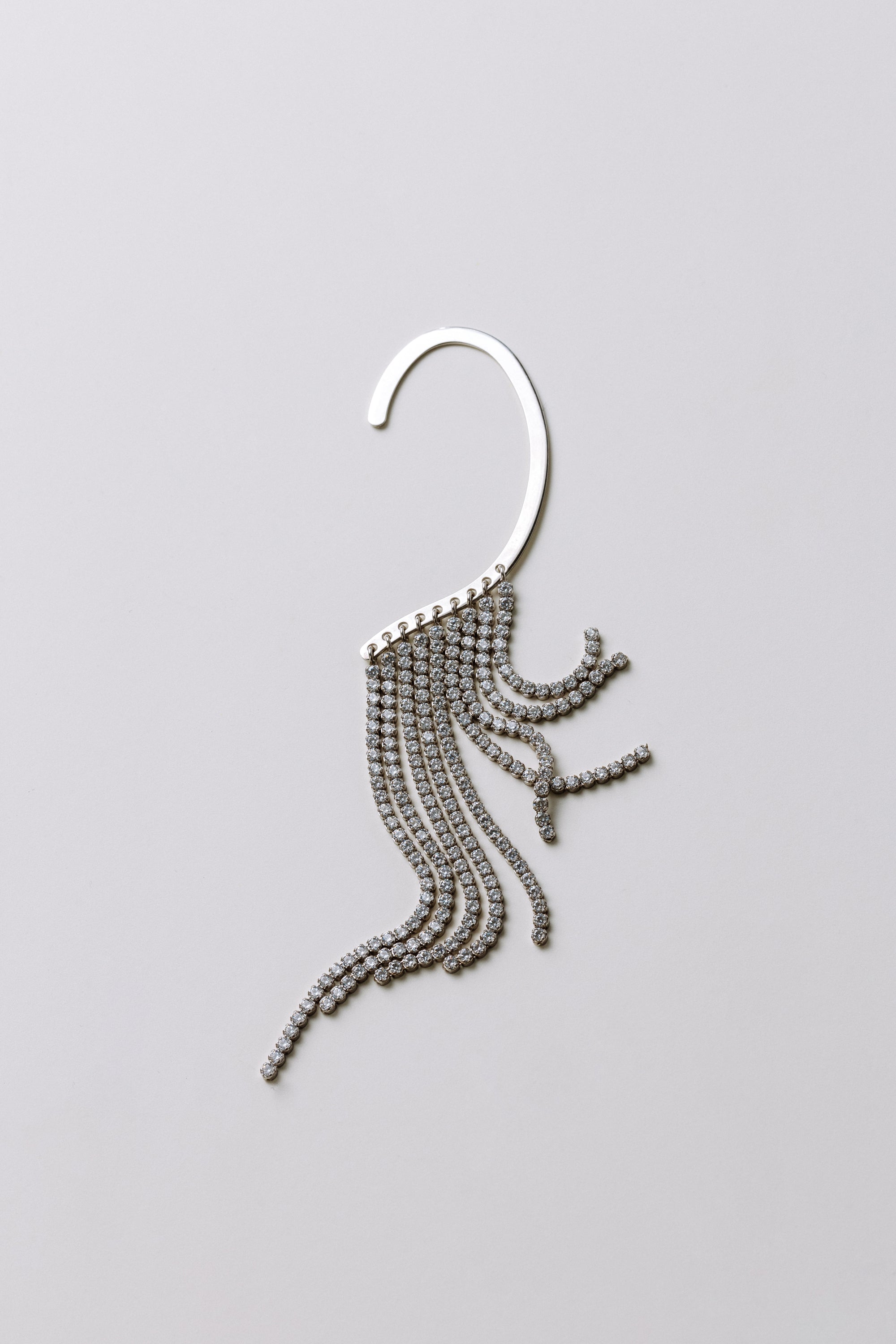 Elegantna i viseća srebrna naušnica sa kaskadnim lancima punim cirkona koji se nježno spuštaju niz liniju vrata. Minimalistički dizajn sa snažnim statement efektom - savršene za večernje kombinacije.