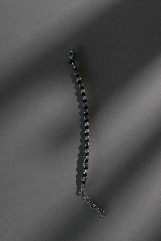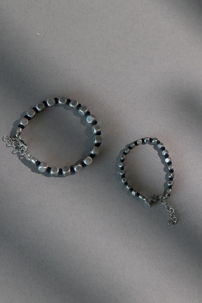 Narukvica za juniore izrađena od grubo obrađenih srebrnih kuglica-kockica koje su nanizane na čvrstu tekstilnu špagu u crnoj ili tamnoplavoj boji.