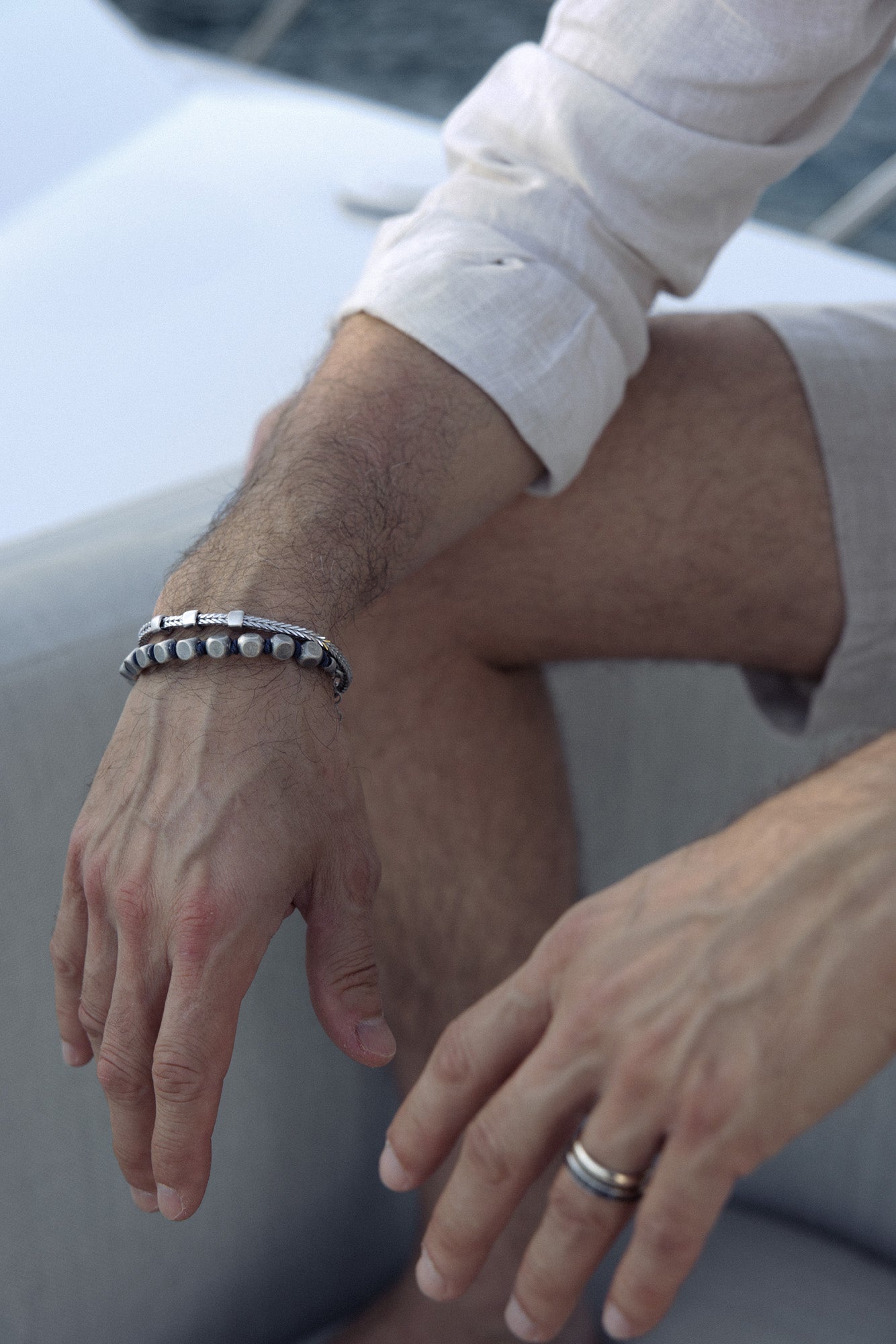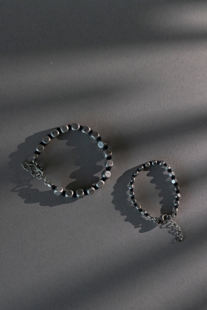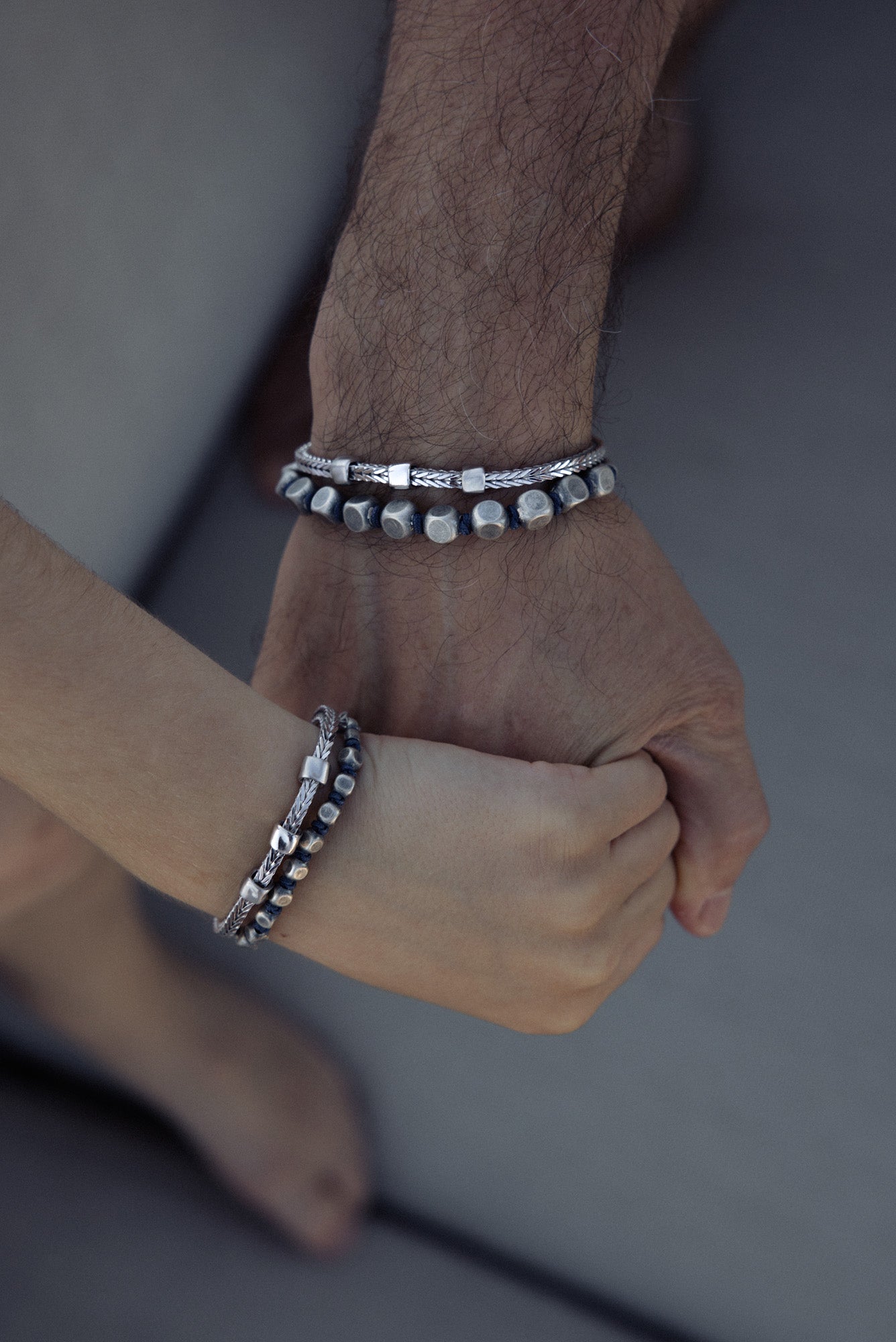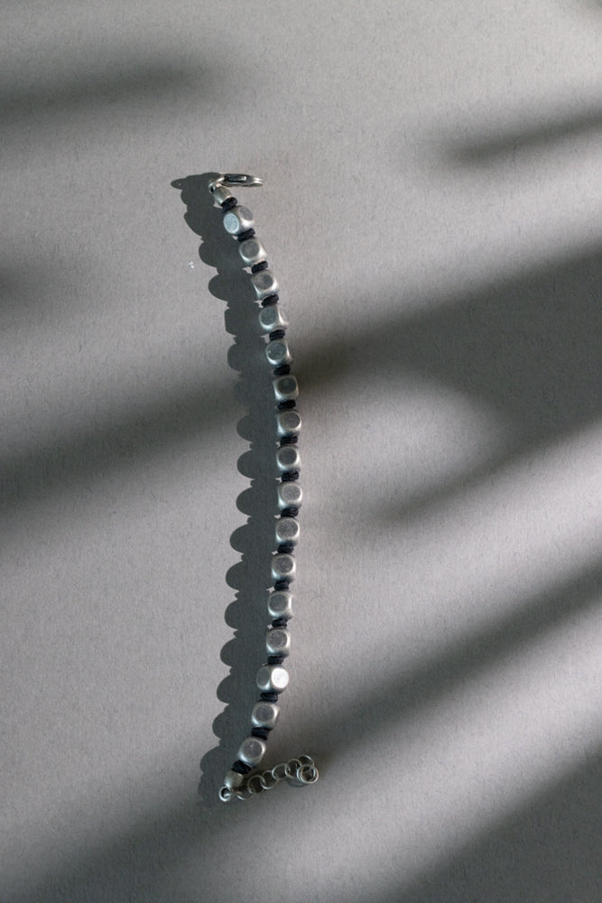 Narukvica je izrađena od grubo obrađenih srebrnih kuglica-kockica koje su nanizane na čvrstu tekstilnu špagu u crnoj ili tamnoplavoj boji.