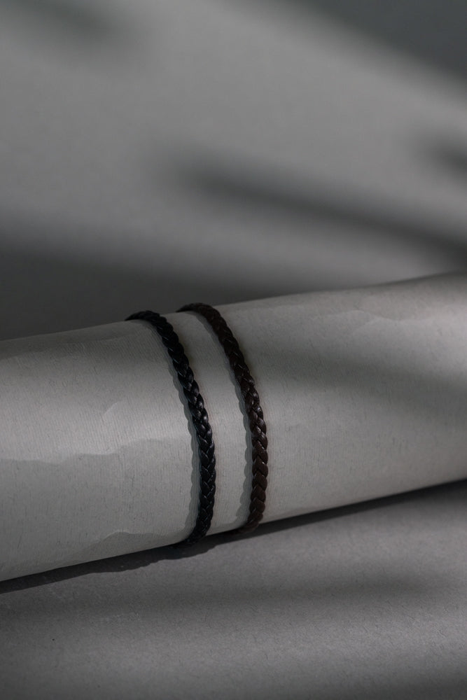 Tanka, jednostavna, i stvorena za slaganje – ova narukvica od pletene kože dostupna je u dvije klasične boje: crnoj i tamno smeđoj.